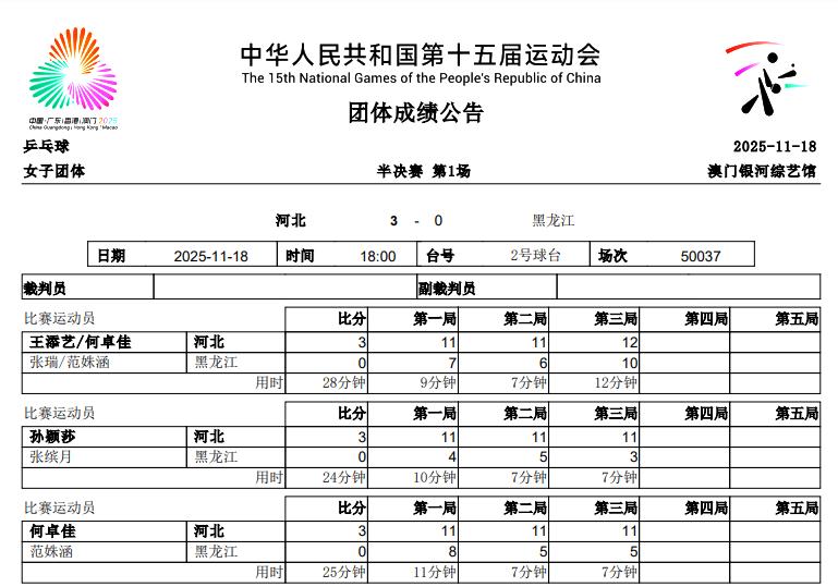 缺少了王曼昱的黑龙江队,在女团半决赛面对孙颖莎领衔的河北队,想要取胜确实太难了,结果河北女团3-0完胜黑龙江队,具体赛果如下: