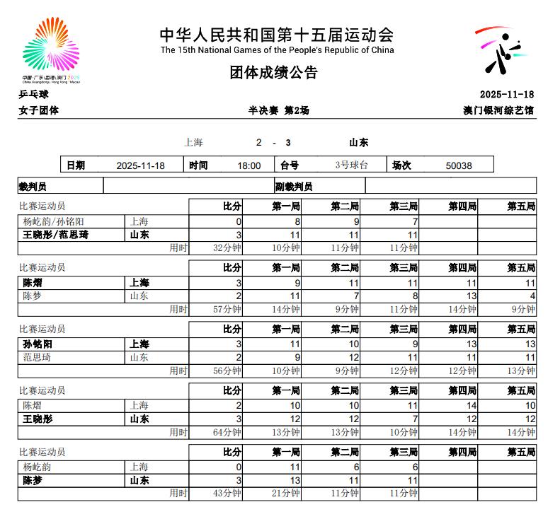 另外一场女团半决赛上海对阵山东,此役两支队伍鏖战了5盘,总耗时超过了4个小时,最终山东女团3-2战胜了上海女团,晋级决赛!