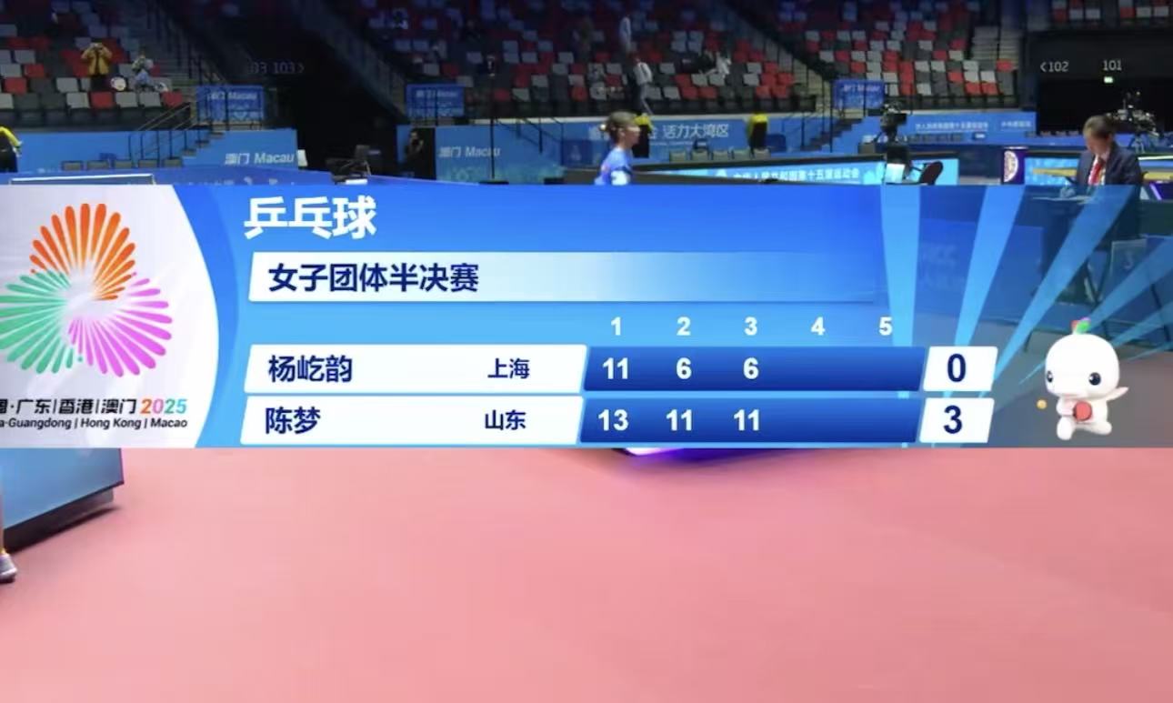 来到决胜盘,山东队的陈梦对阵上海队的削球选手杨屹韵,打削球最考验一名球员的基本功,而陈梦作为连续两届奥运女单冠军,基本功是没有任何问题的,结果陈梦3-0战胜杨屹韵,至此这场比赛一共耗时4小时12分钟,最终山东队3-2战胜上海,晋级女团决赛!
