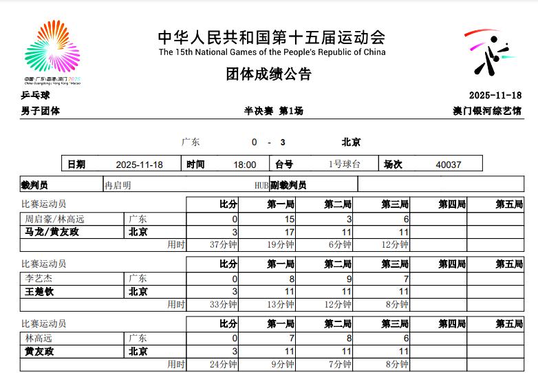 至此黑龙江男团将与广东男团,争夺本届全运会的男团铜牌,这场比赛将会在11月20日10:00进行;而北京队将与上海队,争夺北街全运会的男团金牌,这场比赛将会在11月20日18:00进行。