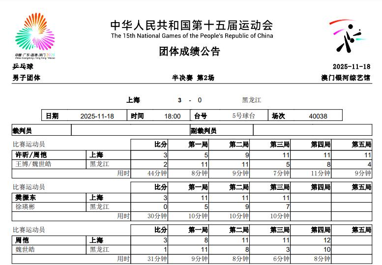 至此黑龙江男团将与广东男团,争夺本届全运会的男团铜牌,这场比赛将会在11月20日10:00进行;而北京队将与上海队,争夺北街全运会的男团金牌,这场比赛将会在11月20日18:00进行。
