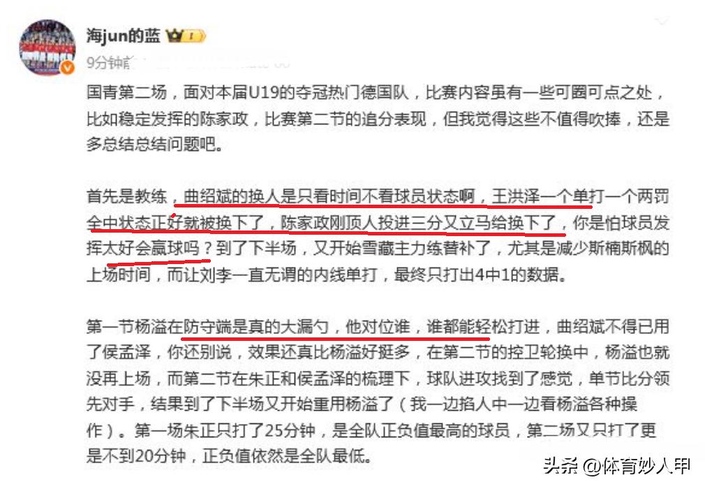 “海jun的蓝表示:曲绍斌的换人是只看时间不看球员状态啊,陈家政刚顶人投进三分球,被换下去了;王洪泽一个单打一个两罚全中状态正好就被换下了。这是怎么回事?怕球员发挥太好会赢球吗?而且,到了下半场比赛,又开始雪藏主力练替补了……