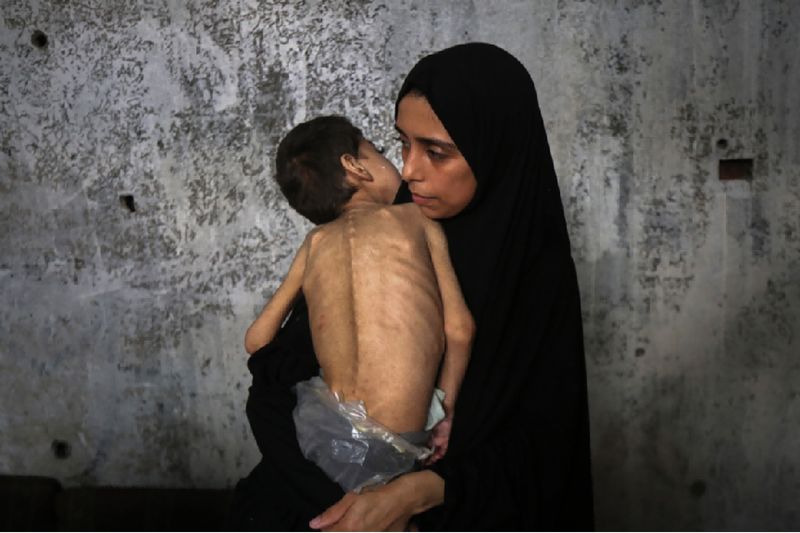 ·当地时间7月25日,在加沙城一处避难所,一名女子怀抱营养不良并患病的儿童。(新华社,里泽克·阿卜杜勒贾瓦德摄)
