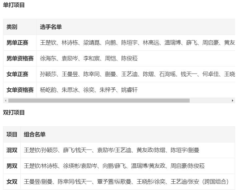 单打方面颁发了多张外卡,包括正赛和资格赛的选手,何卓佳、王晓彤、薛飞、黄友政等8人直接入围正赛,徐海东、袁励岑、杨屹韵、朱思冰等10人获得资格赛的外卡,已经是最大化的给满名额了,最终名单也已经确定,一共33人出战比赛,王楚钦、蒯曼、钱天一、黄友政、王艺迪、薛飞、袁励岑都是兼三项比赛。