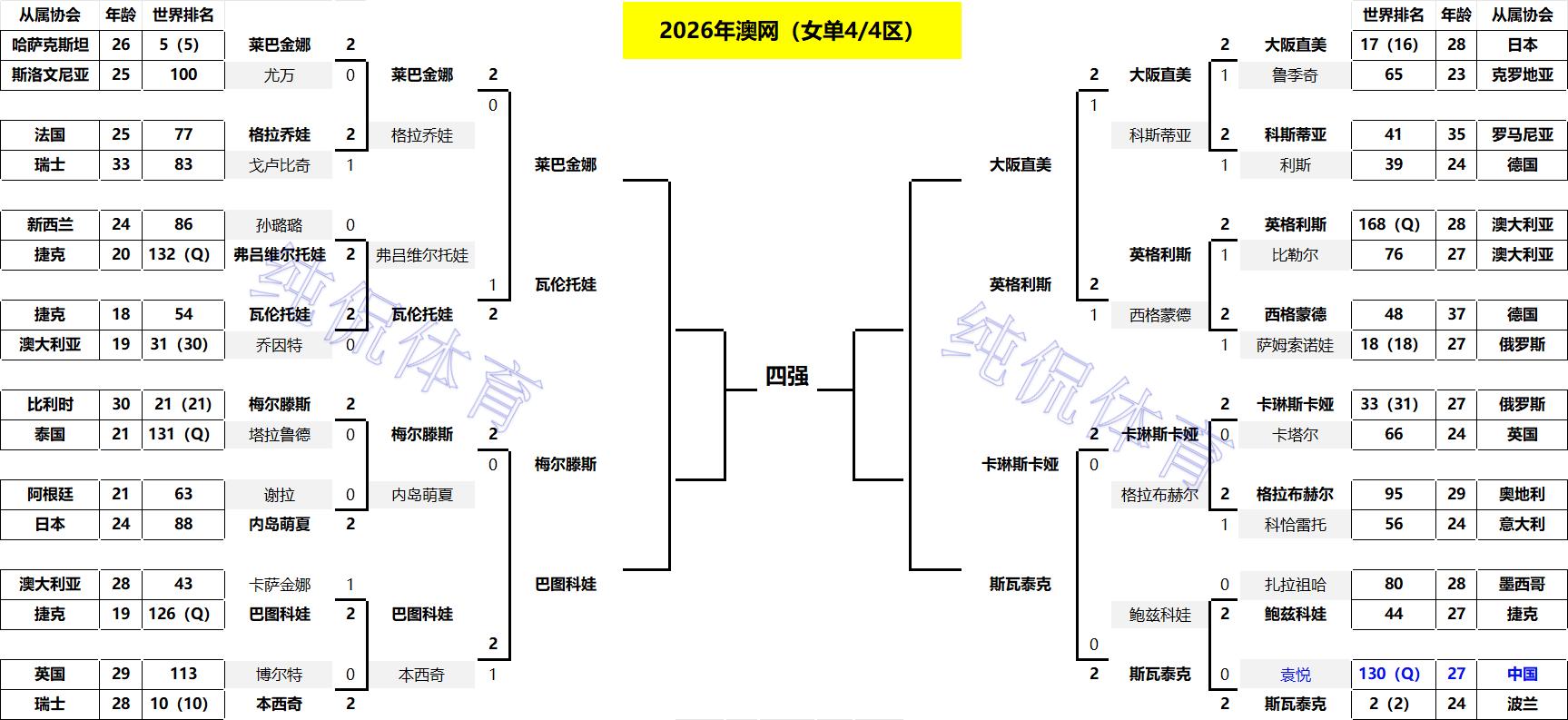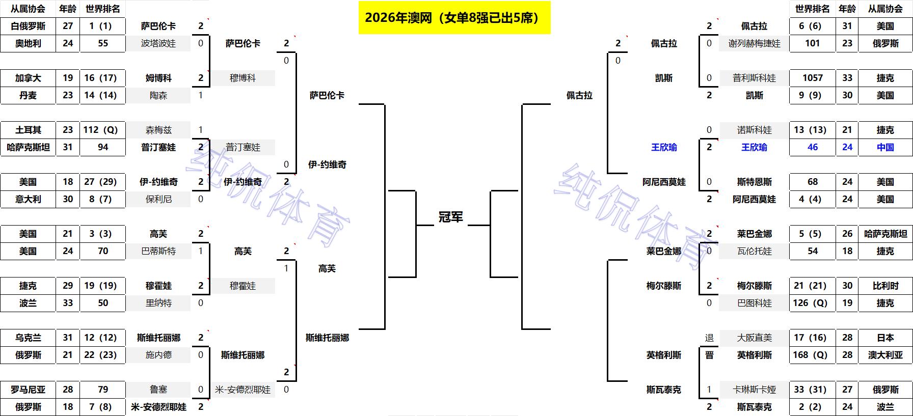 就在王欣瑜与阿尼西莫娃这场比赛进行之前,女单八强也诞生了5席,分别是头号种子白俄罗斯重炮萨巴伦卡、3号种子美国名将高芙、6号种子美国名将佩古拉、12号种子乌克兰名将斯维托丽娜、29号种子美国选手伊娃-约维奇。