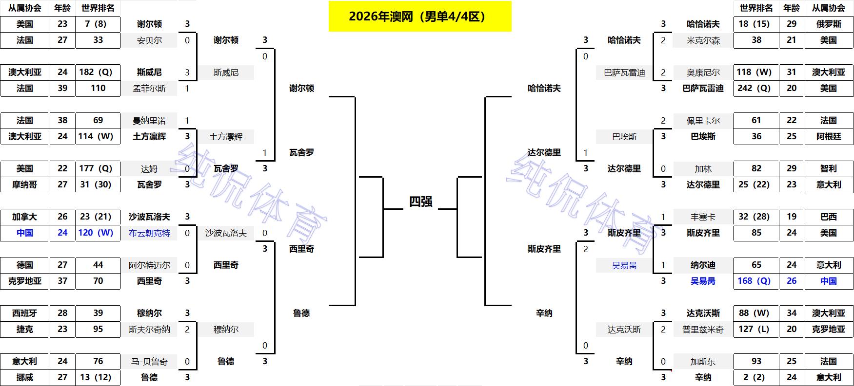 这其中德约科维奇本应该在今天与16号种子捷克选手门希克进行男单正赛第四轮(1/8决赛)的比赛,结果门希克由于伤势选择退赛了,至此38岁的德约科维奇直接晋级到了本届澳网八强(最新签表如下图所示)。