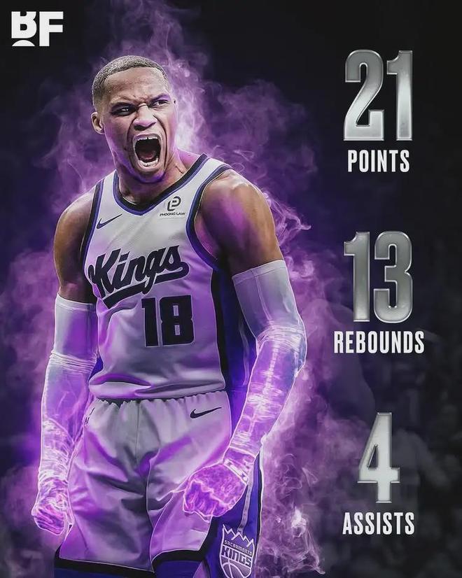 威少24投8中,三分12中5,罚球2中0,得到21分13篮板(6前场)4助攻2抢断1盖帽4失误,正负值+1。第四节最后时刻,威少连砍5分,其中包括绝平三分,帮助国王拖进加时。到了加时赛,威少有一次三分犯规,但是瑕不掩瑜。