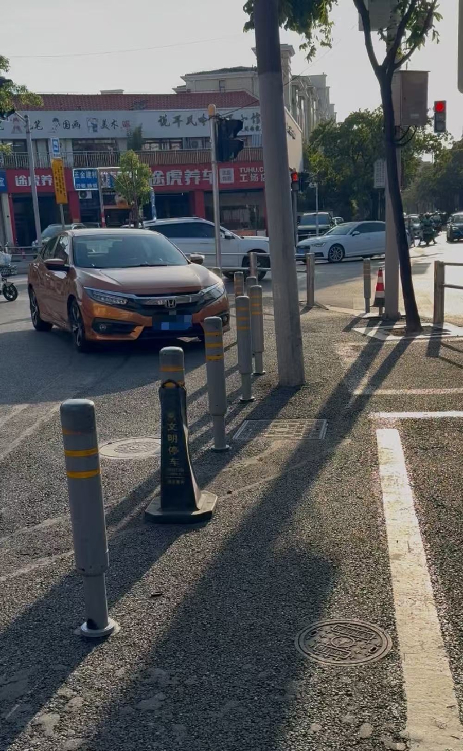 市民李先生也是隔离桩“受害者”之一。作为一名视障人士,他注意到这条街没有盲道。树木、电线杆甚至路边的垃圾都成了他每天通勤的障碍,路口设置曲折的隔离桩更是让他数次“碰壁”。这一路口复杂的停车状况对于正常人来说尚且不好走,加装护栏带给整条街的副作用,更是成倍作用在了视障人士身上。