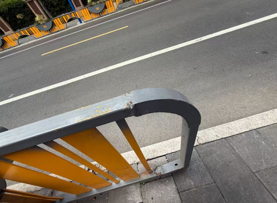 护栏尽头车辆淤积,人行区域缺乏盲道设施