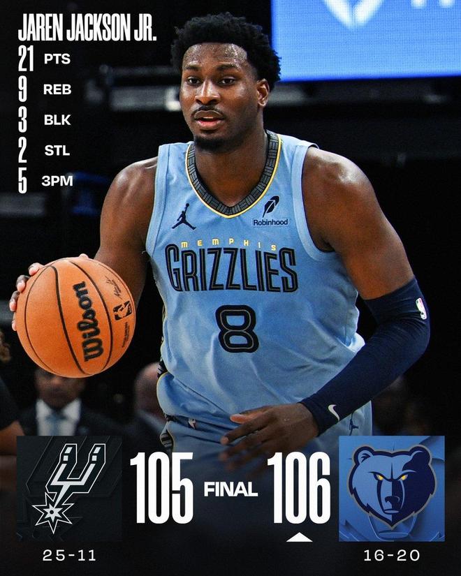 灰熊队,小贾伦杰克逊16中7,三分球7中5砍下了21分9板2助2断3帽,在攻防两端发力。斯潘塞15中8高效的砍下了21分8板8助,末节独得13分2板1抢断成为取胜功臣。文斯威廉姆斯7中5,三分球6中4得到了15分6板5助,从替补席爆发。阿尔达马10中3,三分球6中1得到10分9板2助2帽、韦尔斯8分3板2助、波普8中3得到6分3板3助、科洛克4分6板1助3帽、GG·杰克逊6中1得到2分7板1助、斯莫尔1板2助。