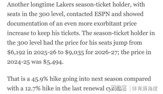 还有铁杆球迷,那可是持有300区域季票的老江湖了。他给ESPN提供了票据记录,这一看,好家伙,那涨幅简直能把人吓晕过去!2025 - 26赛季,他这季票价格是6192美元,到了2026 - 27赛季,直接飙升到9035美元!要知道,2024 - 25赛季才5494美元呢。这意味着下赛季涨幅高达45.9%,而上一次续费周期的涨幅才12.7%,这差距,就像坐电梯和爬楼梯一样,一个快得吓人,一个慢得要命。
