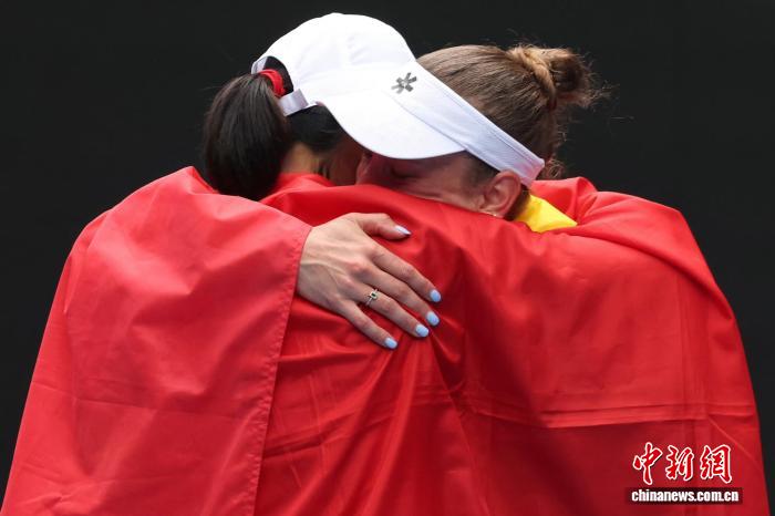 张帅(右一)夺冠后身披国旗,与比利时搭档梅尔滕斯相拥。图源澳大利亚网球公开赛官方微博