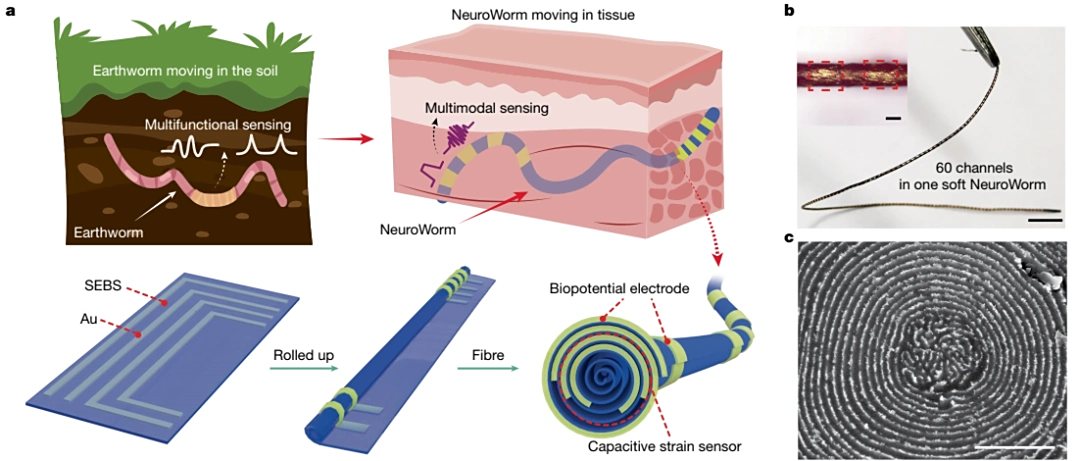 研究团队成功研发出了如头发丝般纤细、柔软可拉伸、可自由驱动的神经纤维电极 —— NeuroWorm(神经蠕虫)。该研究首次提出了脑机接口“动态电极”的新范式,打破了植入式电极的“静态”传统,为脑机接口电极的研究与应用开辟了新方向。