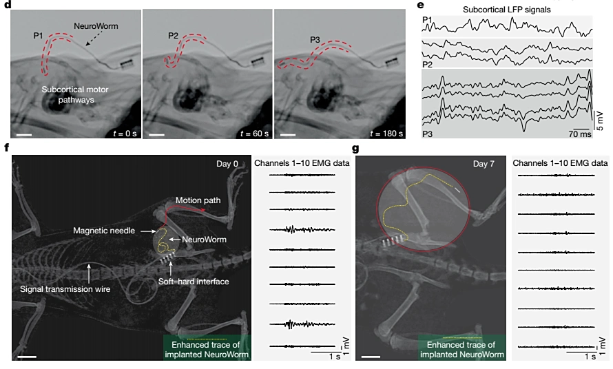 为了让制备的电极“动起来”,团队在电极的一端增加了微小的磁头,通过结合高精度磁控系统和即时影像追踪技术,使电极能够在体内自主调控前进方向,并能稳定记录高质量的生物电信号。这样的“动态电极”可以在兔子颅内“游走”,根据需要主动更换监测目标,研究团队给它命名为 NeuroWorm—— 神经蠕虫。