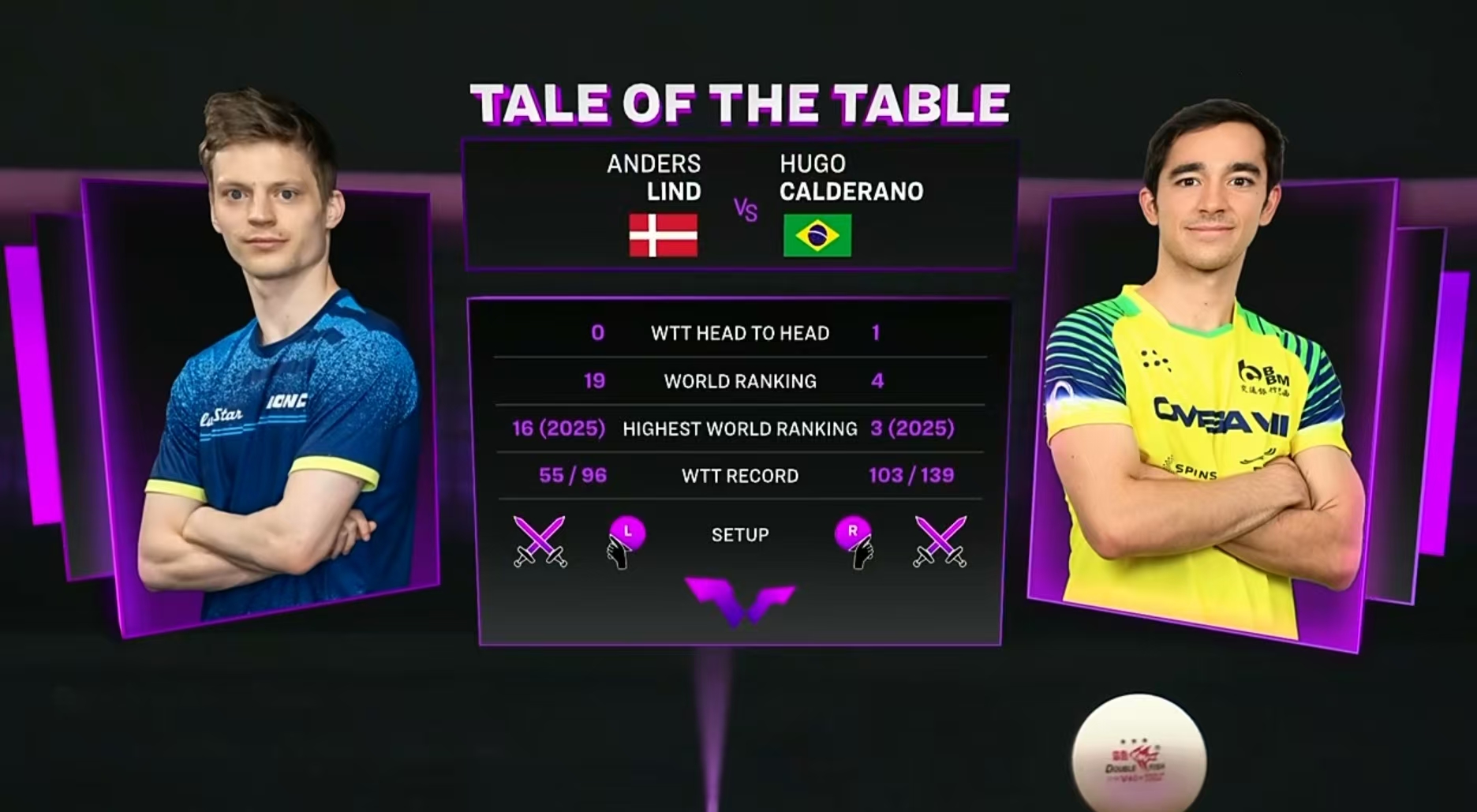 雨果和林德二人在男单WTT的舞台,有过1次交手记录,雨果取得了胜利,而论名气而言,今年4月份夺得乒乓球单打世界杯男单冠军的雨果,完全在林德之上,不过林德能够在男单1/4区突出重围晋级四强,确实具备一定实力,下面带来这场男单半决赛的详细信息。