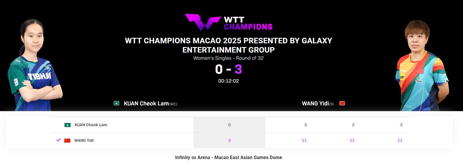 王艺迪4-1领先,关卓琳追至2-4,王艺迪又强势连得6分,10-2拿到全场比赛8个赛点,关卓琳挽救一个赛点,王艺迪还是以11-3的比分又赢下第三局,从而以大比分3-0完胜中国澳门选手关卓琳,顺利晋级女单16强!值得一提的是,这场比赛仅耗时12分钟。