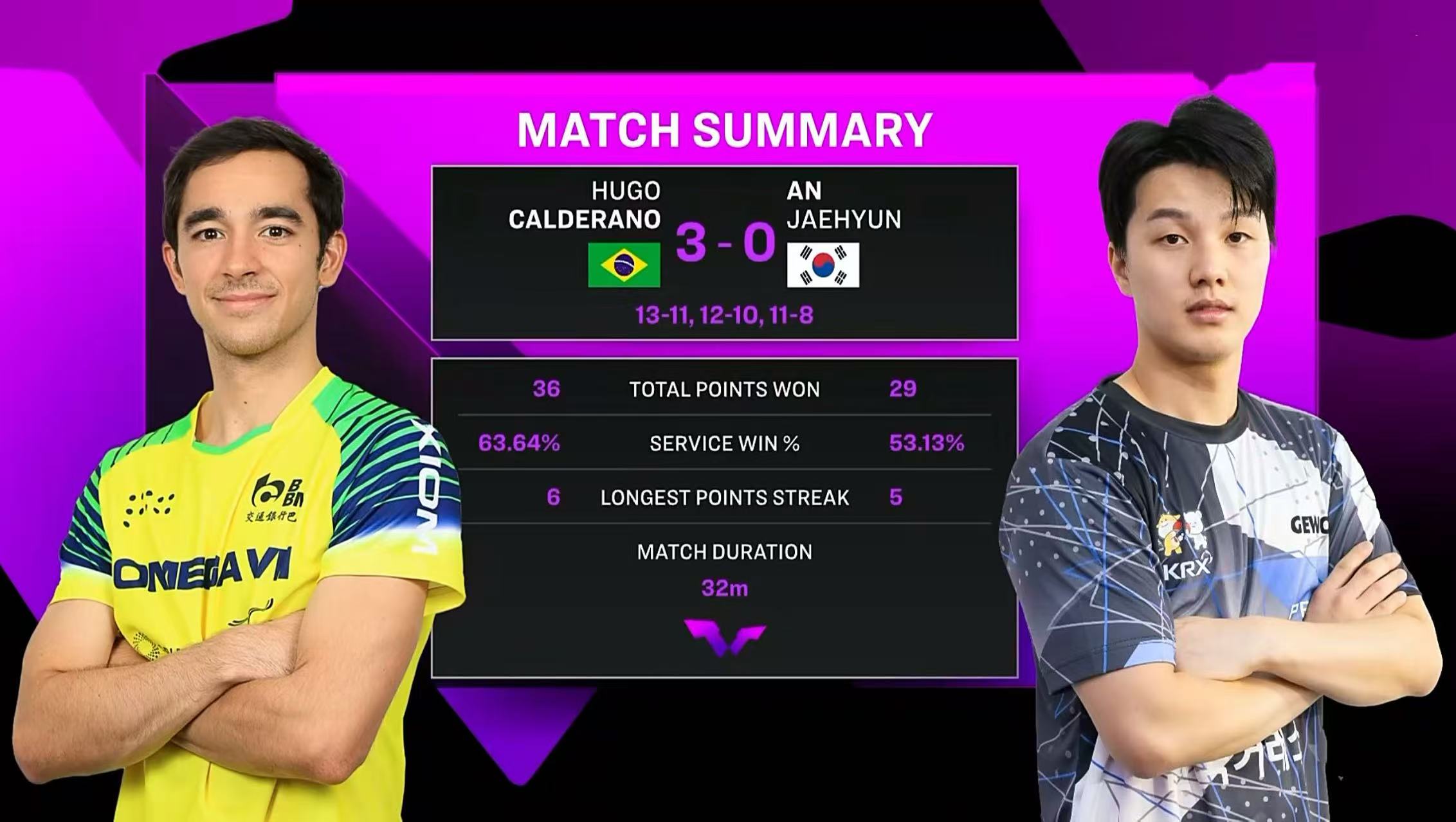 另外一场结束的男单首轮争夺,世界冠军巴西名将雨果,3-0横扫韩国名将安宰贤,其中雨果在第一局和第二局均是逆转取胜。
