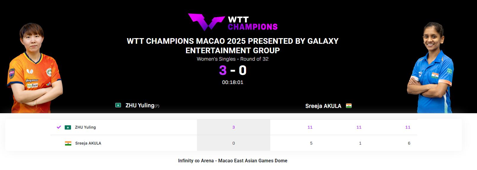 而结束的两场女单首轮争夺中,前国乒球员、现代表中国澳门出场的朱雨玲,3-0完胜印度选手阿库拉,整场比赛仅耗时18分钟,朱雨玲就速胜晋级,其中第二局更是强势轰出了11-1的悬殊比分,前女单世界第一绝非浪得虚名!