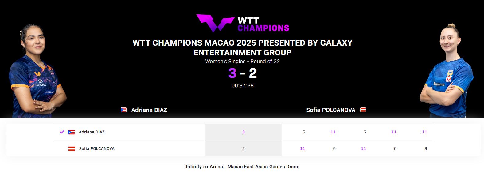 另外一场已经结束的女单1/16决赛,波多黎各名将阿德里安娜-迪亚兹,3-2逆转奥地利选手波尔卡诺娃,同样晋级女单16强。