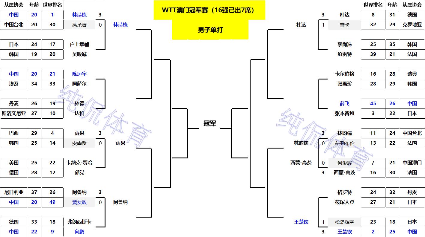 林诗栋3-0轻松击败与其同龄的中国台北选手高承睿;王楚钦3-1力克日乒18岁新星松岛辉空;黄友政则0-3完败于“非洲一哥”尼日利亚名将阿鲁纳。
