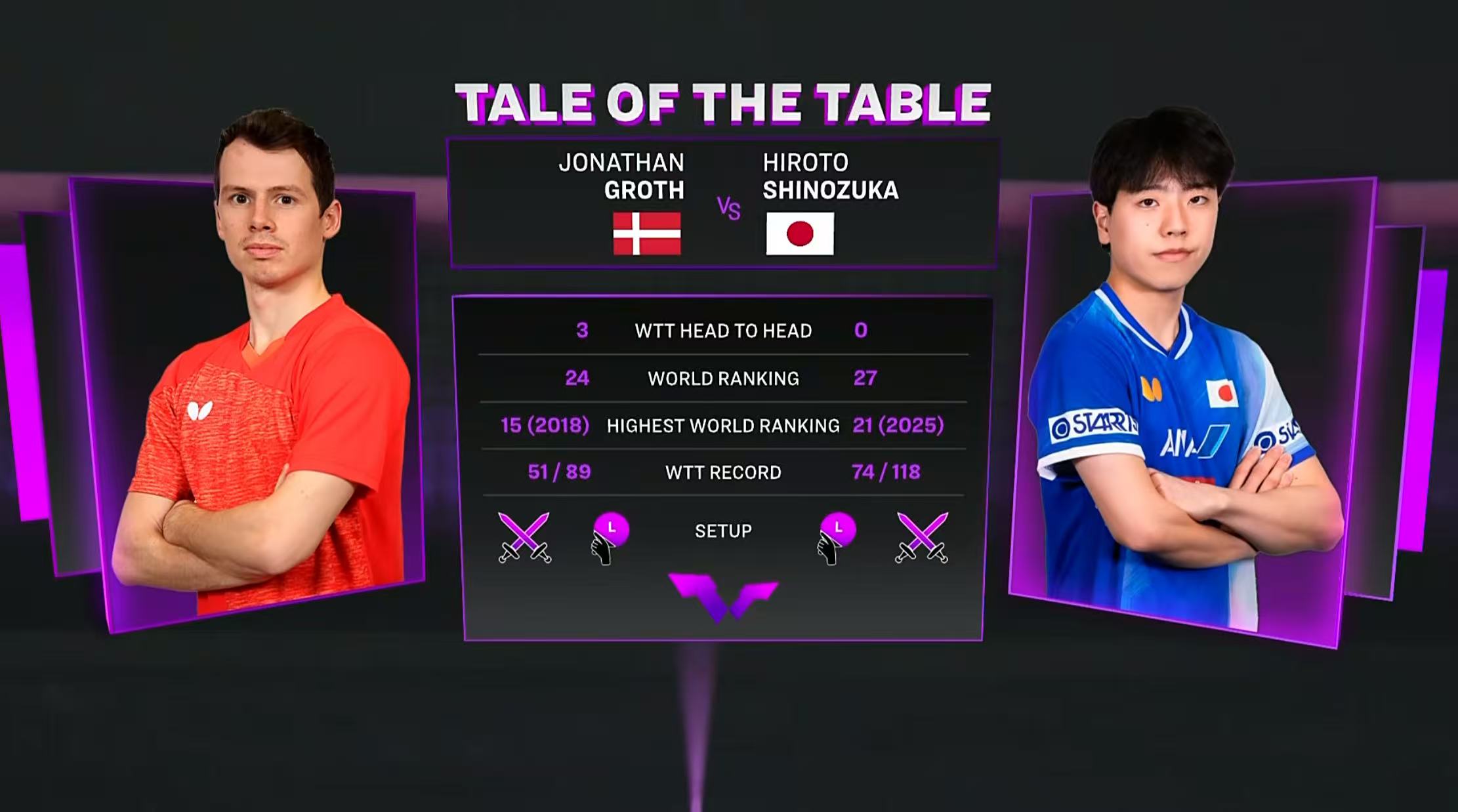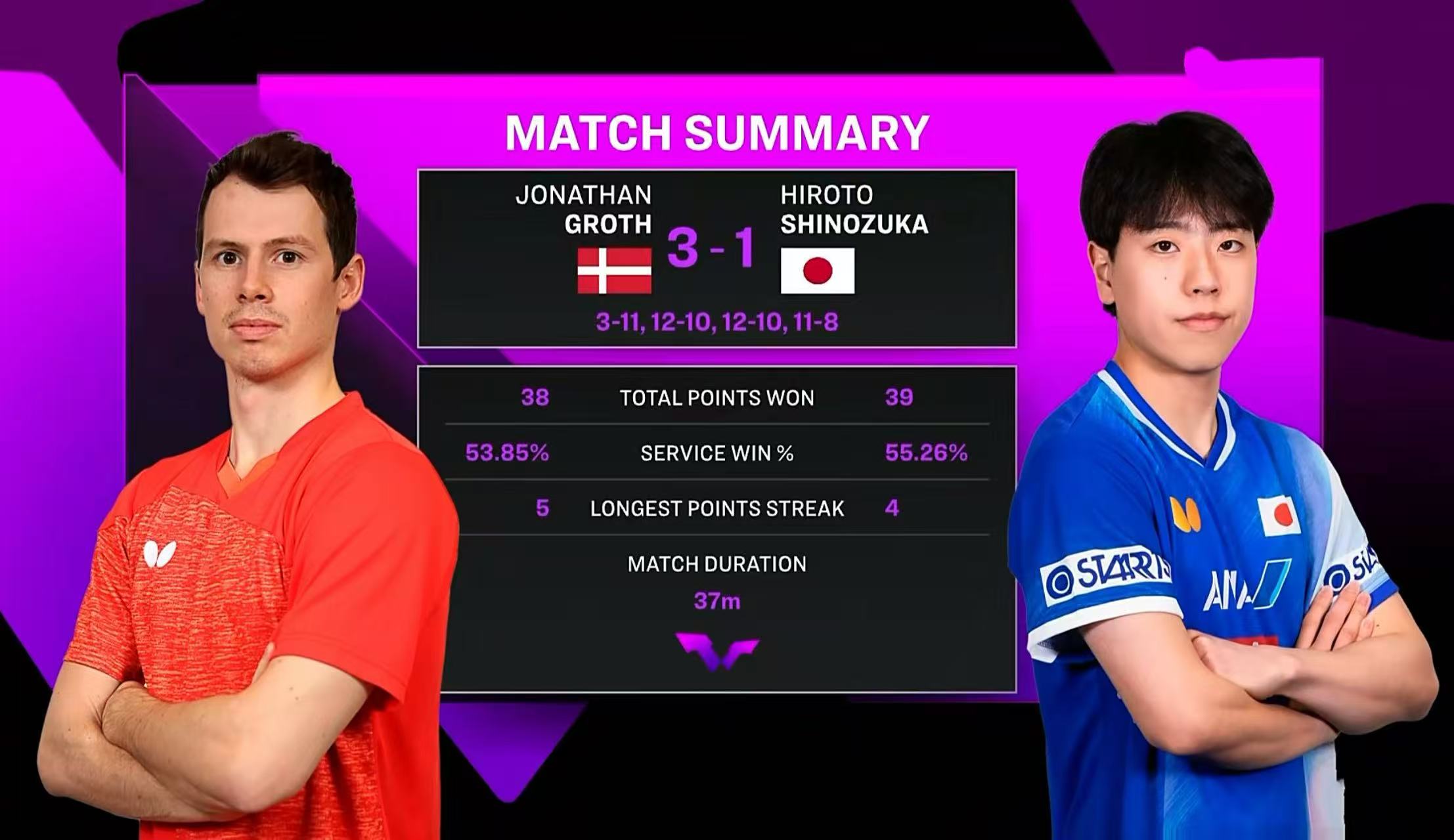 丹麦选手格罗特32岁,世界排名第24位,这名球员单打成绩也算一般,不过在欧洲算是一位实力不俗的球员,上文已经提到,在今年1月上旬进行的WTT多哈球星挑战赛男单半决赛,当时格罗特3-0完胜了筱塚大登,那场比赛也是二人最近的一次交锋。