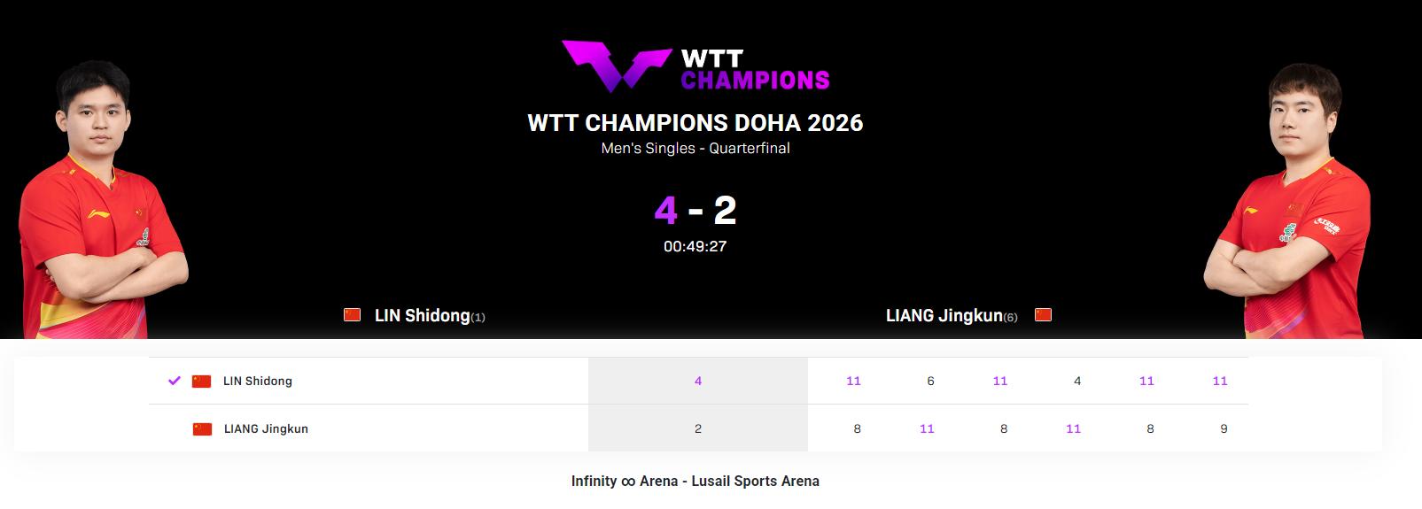 梁靖崑在前半段处于1-2分的领先,中后段林诗栋7-6将比分反超,梁靖崑请求了暂停。暂停回来,林诗栋又连得2分9-6领先,梁靖崑追至7-9,林诗栋10-7拿到全场比赛3个赛点。梁靖崑挽救2个赛点,林诗栋还是以11-9的比分赢下第六局,至此大比分4-2战胜梁靖崑,率先晋级男单四强。