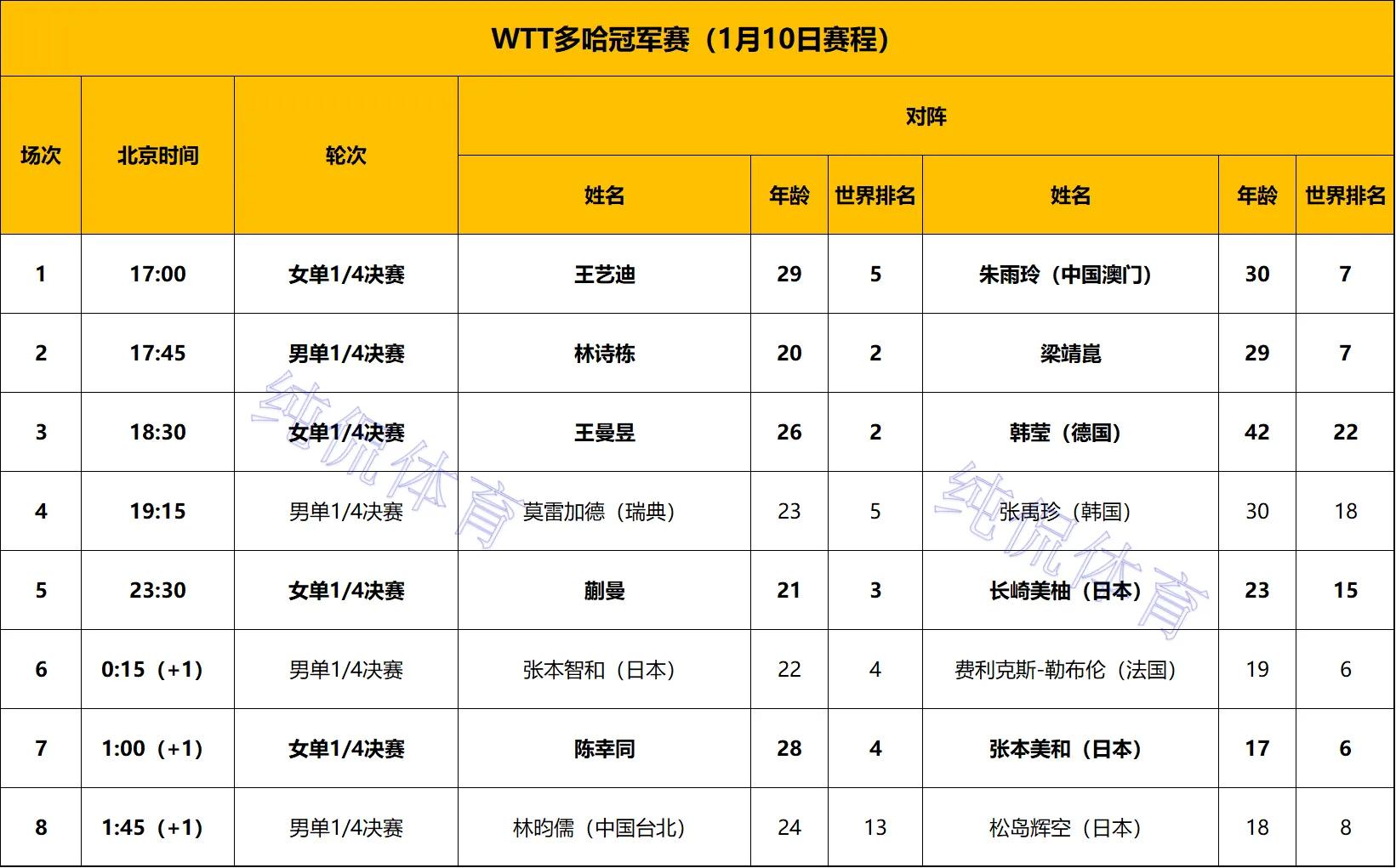 北京时间1月10日晚至11月凌晨,2026年WTT多哈冠军赛进入第4个比赛日的争夺,这一天也是倒数第二个比赛日,男、女单将进行1/4决赛,诞生男、女单四强名额,随着比赛进行,过程将会越来越精彩,下面带来详细信息。