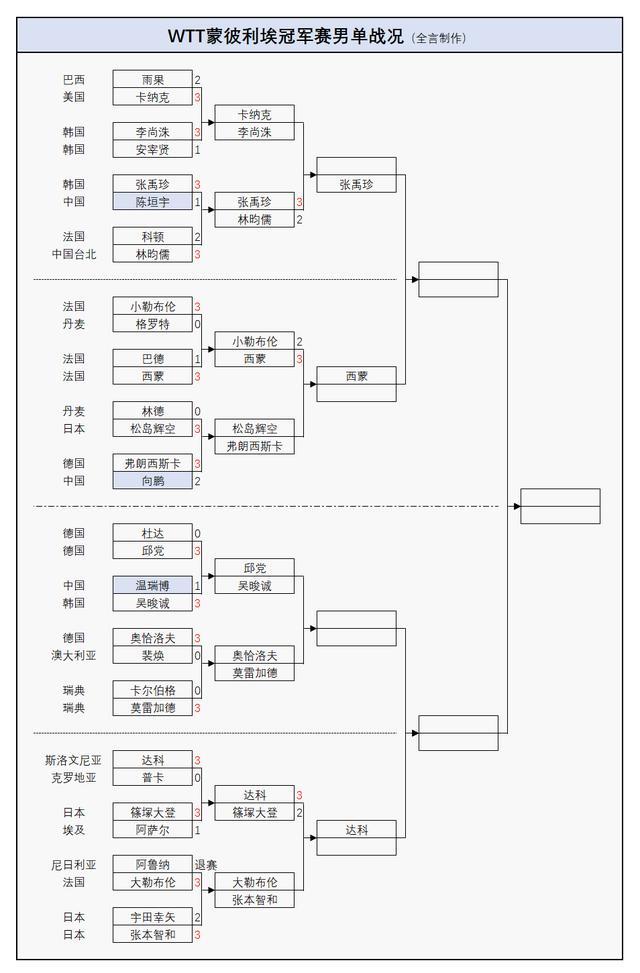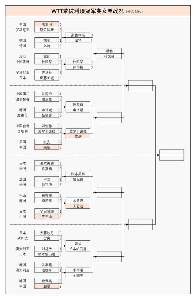 至于外协会也是冷门迭出,世界冠军雨果、朱雨玲、伊藤美诚同样一轮游,另一位世界冠军篠塚大登也倒在第二轮,小勒布伦、林昀儒、斯佐科斯等名将也已经折戟沉沙,目前单打已有3男2女晋级8强,其余16强对阵安排也已经全部出炉,以下为两大项目的晋级详情: