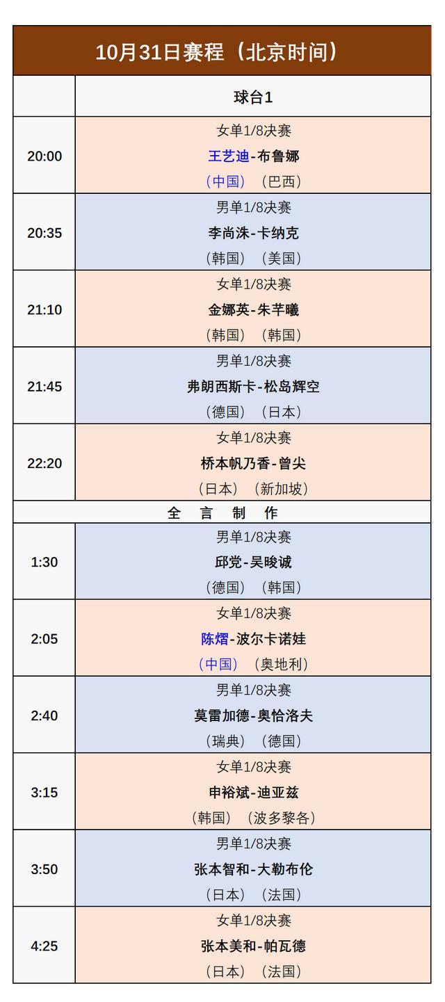根据安排,国乒将在第四个比赛日参加两场对决,首先是北京时间10月31日晚20:00王艺迪与巴西名将布鲁娜之战,这场球王艺迪的优势相对比较大,但近期布鲁娜的进步非常快,完全具备与亚洲一线高手对垒的水平,国乒绝对不能放松警惕。