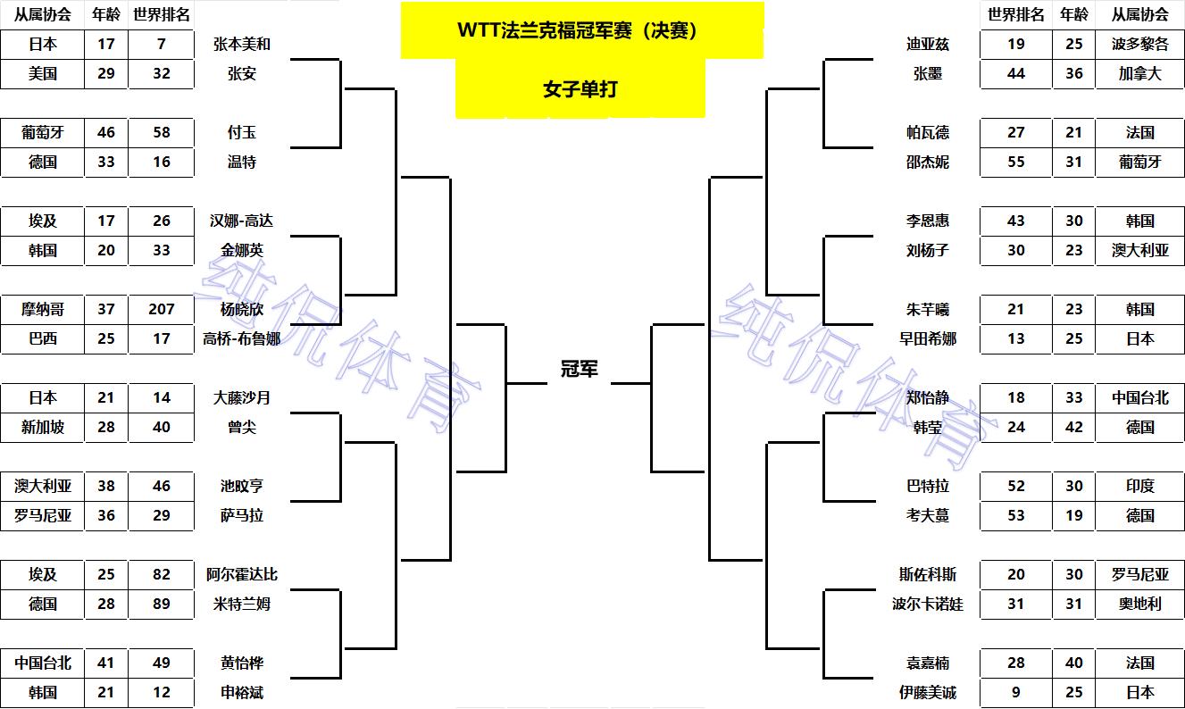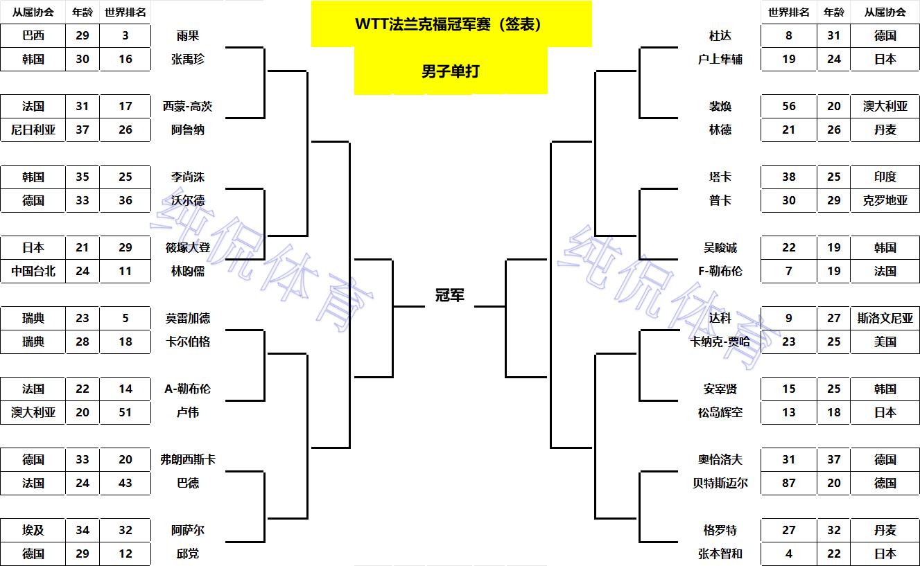 本次WTT法兰克福冠军赛,虽然国乒球员缺席,但依旧有众多外协会高手参赛,其中日韩派出了主力球员参赛,日韩单打均有8人参赛,男、女单各4人。本人整理了详细签表,如下图所示。