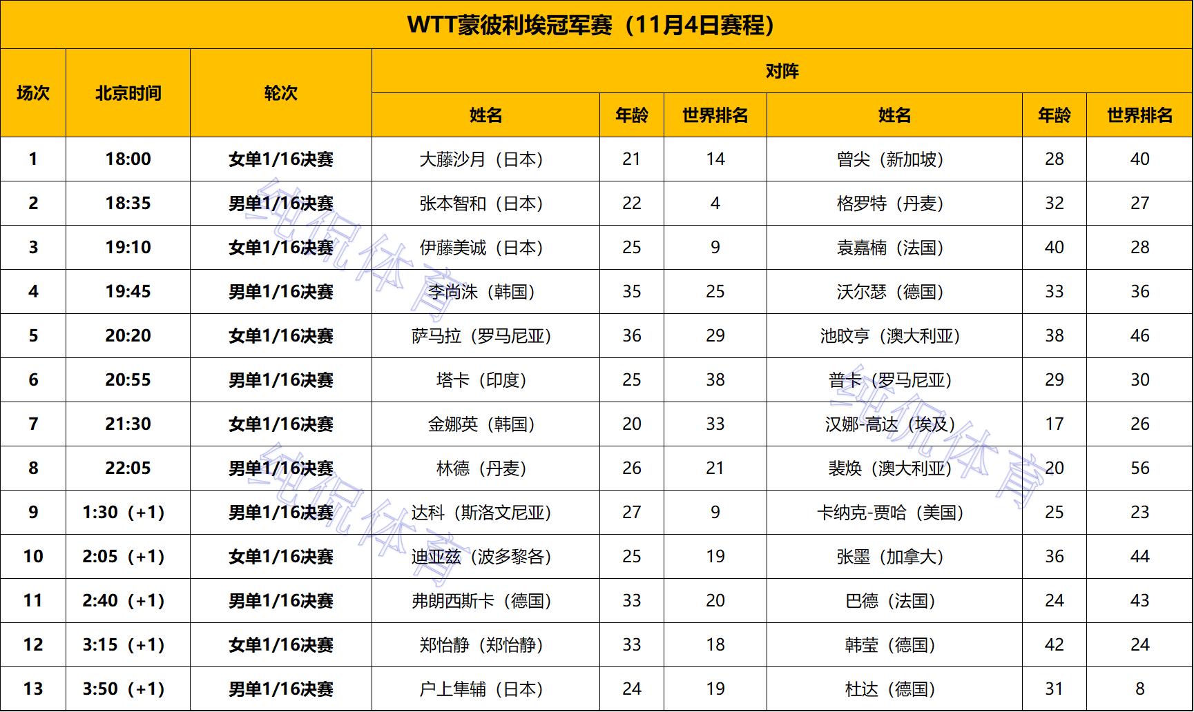 根据赛事安排,在11月4日首个比赛日,全天将进行13场比赛,包括7场男单1/16决赛和6场女单1/16决赛,具体赛程见如下图表,11月9日将诞生男、女单冠军。