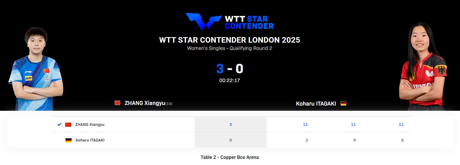 女单资格赛一共为3轮,张翔宇在女单资格赛首轮轮空,在已经结束的2个比赛过后,张翔宇连胜2场顺利晋级女单正赛!女单资格赛第二轮,世界排名第162位的张翔宇,3-0完胜世界排名第269位的德国日裔球员坂垣心春;
