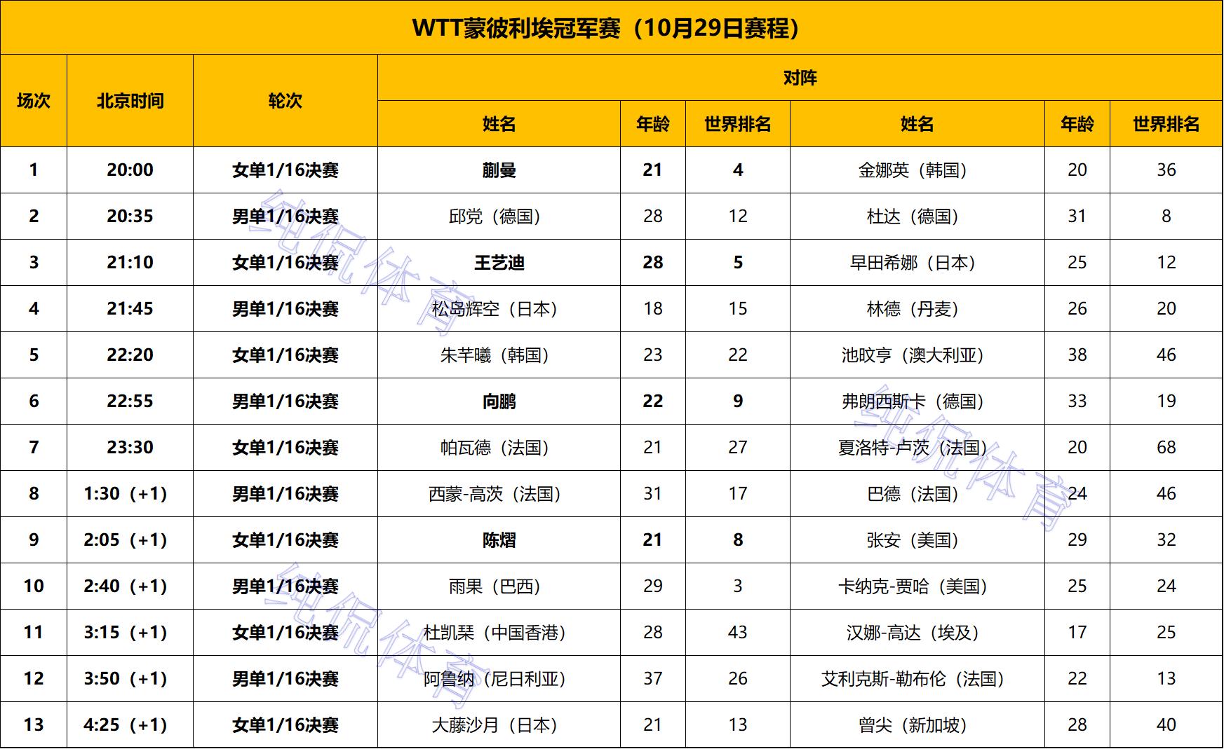北京时间10月29日晚至30日凌晨的第二个比赛日,国乒参赛的7名球员余下的4人(向鹏、蒯曼、王艺迪、陈熠)将会迎来登场亮相,下面带来详细赛程信息。
