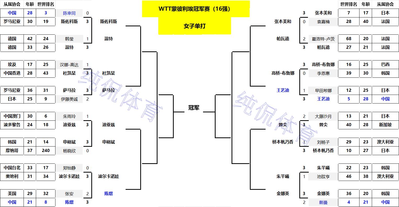 北京时间10月31日凌晨,乒乓球WTT蒙彼利埃冠军赛继续进行,男、女单16强正式出炉!本人详细整理了对阵签表,如下图所示。国乒单打7人参赛5人出局;日本队9人参赛4人出局;韩国队表现最好,8人参赛多达6人晋级16强,下面带来详细信息。