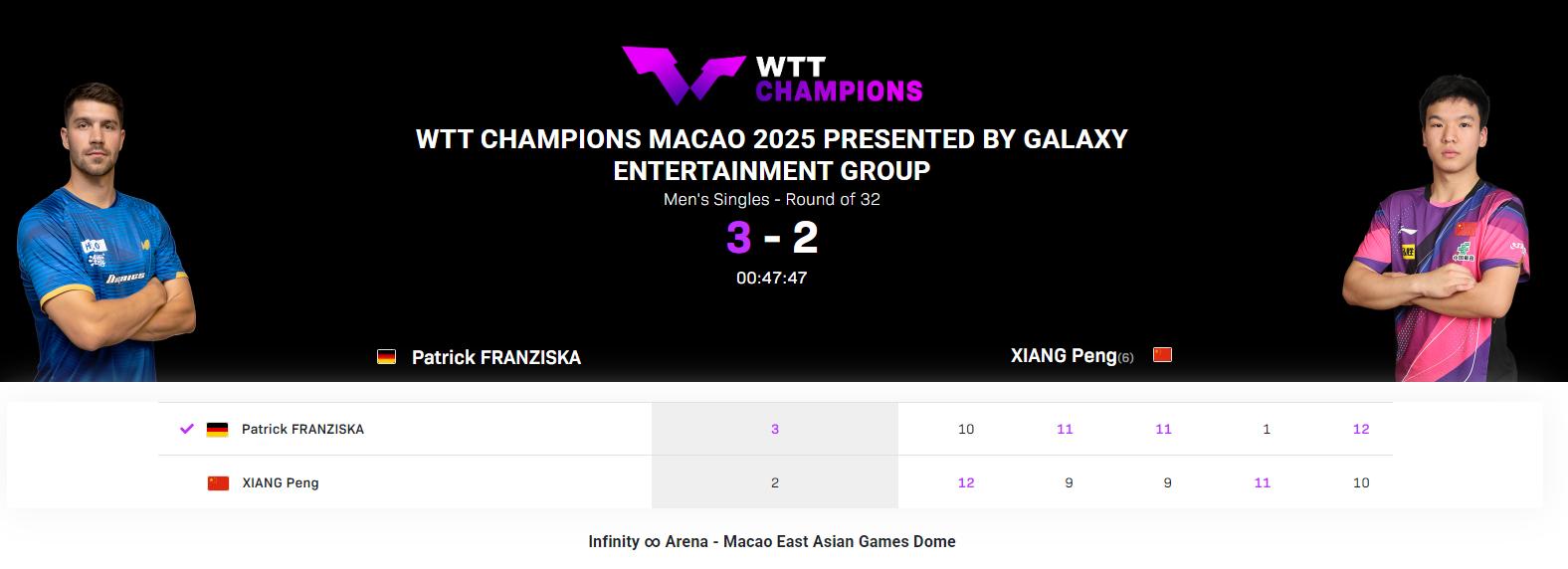 国乒男单参赛3人分别是向鹏、陈垣宇、温瑞博,结果全部一轮游出局!向鹏2-3不敌德国名将弗朗西斯卡;陈垣宇1-3不敌韩国选手张禹珍;温瑞博也是以1-3的比分失利,并且同样输给了韩国选手,不敌韩国19岁新星吴晙诚。