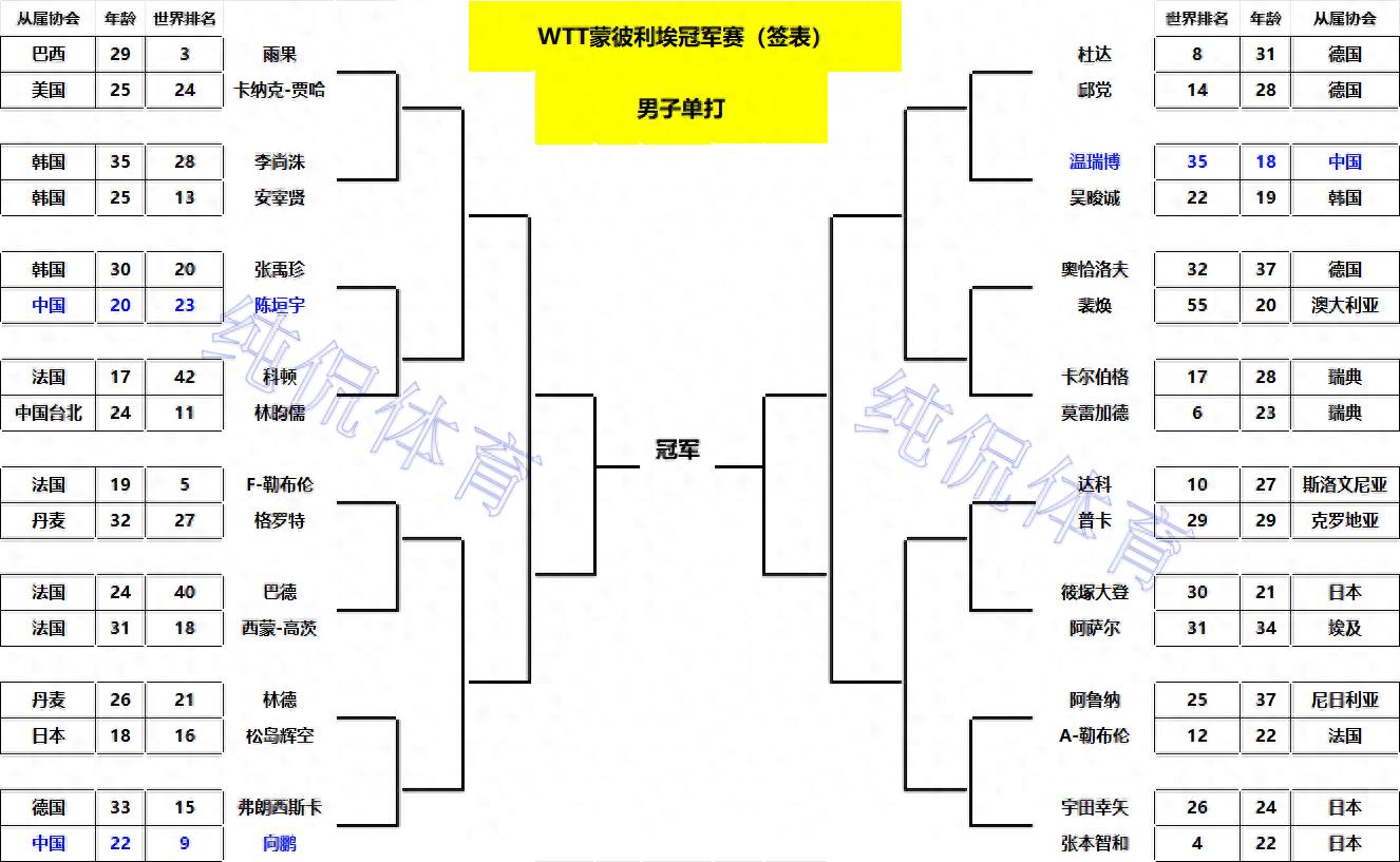 世界排名第35位的国乒男单18岁新星温瑞博,将独守男单下半区,男单首轮将要对阵韩国19岁新星吴晙诚,而在男单下半区中,有赛会男单4号种子、瑞典名将莫雷加德;赛会男单5号种子、德国名将杜达以及赛会男单2号种子、日本选手张本智和。