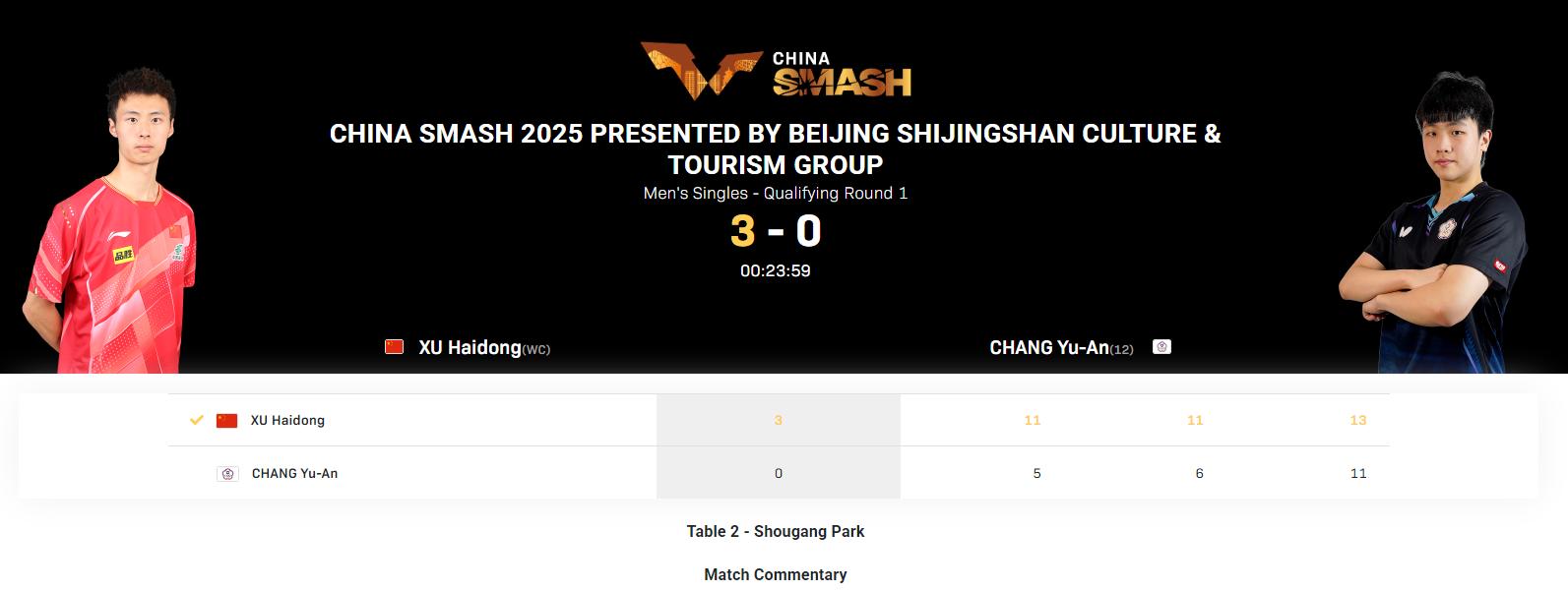 之后徐海东又挽救了一个局点,双方又战至11-11平,关键时刻,徐海东还是把握住了机会,连得2分13-11又赢下第三局,大比分3-0完胜中国台北选手张佑安,晋级男单资格赛第二轮,为国乒队伍在本次WTT中国大满贯赢得开门红,恭喜徐海东!