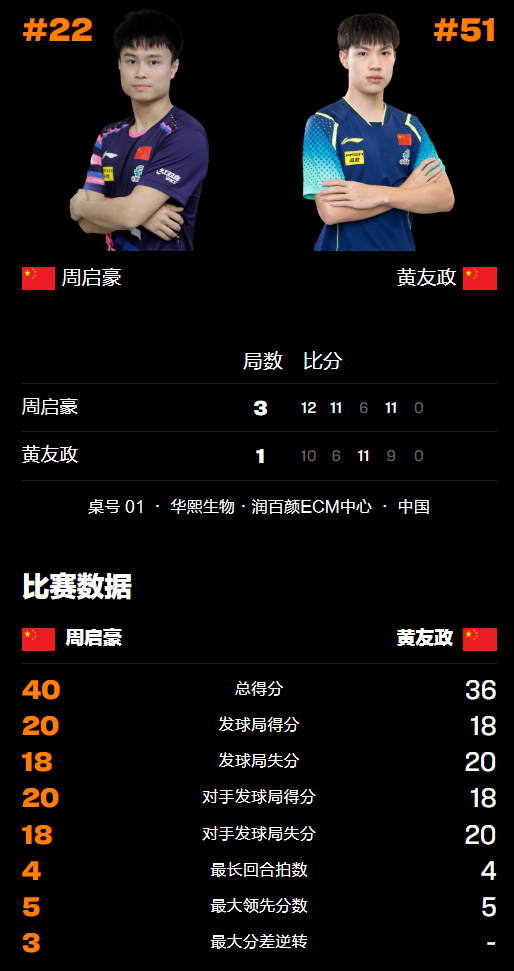 第二局黄友政虽然反手犀利但正手失误率依旧非常高,随即又被对方咬住比分,中间段周启豪成功实现逆转并再次以10-6领先,随后拒绝被追平、速战速决以11-6拿下。