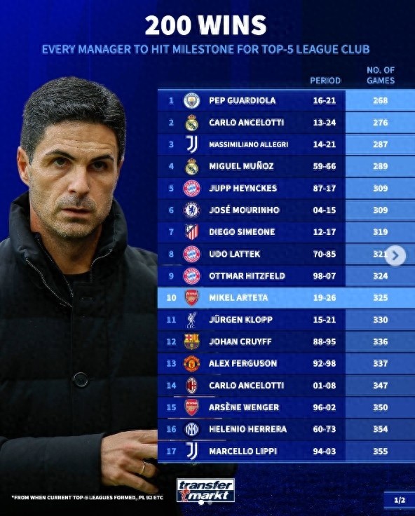 直播吧1月31日讯 阿森纳主帅阿尔特塔在英超中已经拿到了200胜,德国转会市场盘点了五大联赛主帅单一俱乐部达成200胜所用场次情况,瓜迪奥拉268场最少,阿尔特塔325场跻身前10,所用场次少于克洛普。