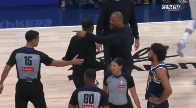 乌度卡第一次暴怒来自于上半场,申京篮下出手被约基奇推搡裁判视而不见,申京摊手追讨裁判结果申京吃T,乌度卡冲进来喷裁判:睁开你们的狗眼,张大你们的狗眼吧。乌度卡也吃T。