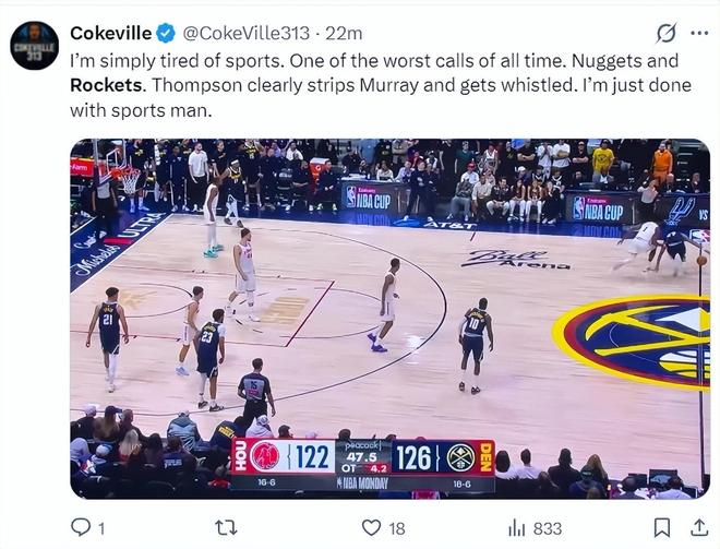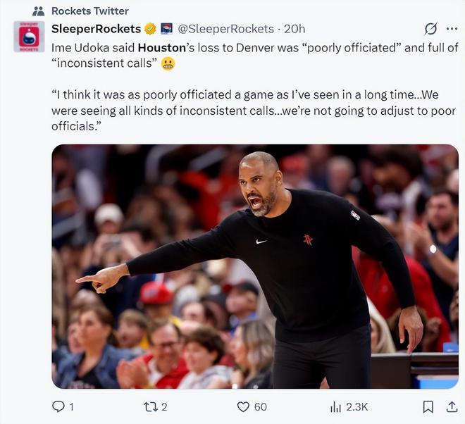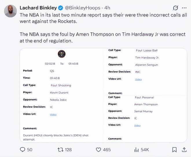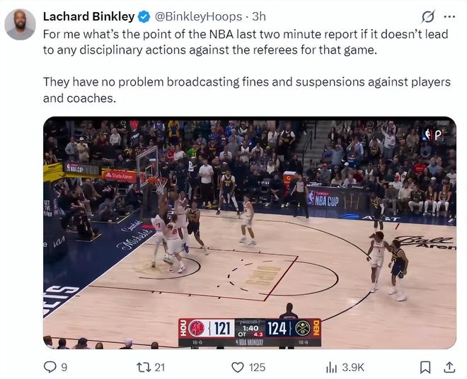 火箭记者兰德里-宾克利转发了三次误判的视频写道:请问最后两分钟裁判报告有什么意义?执法裁判出现错误没有任何的处罚手段,但联盟却可以毫不避讳的对教练、球员进行罚款与禁赛,这合理吗?