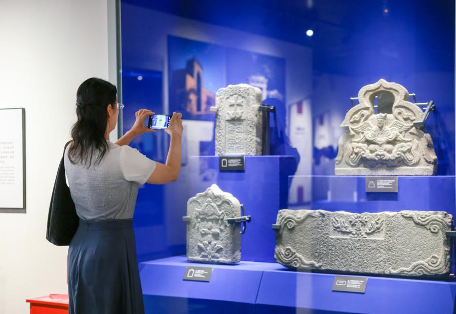 包容并蓄,和全世界做生意,是商业逻辑,也是人文底色。不同文明在泉州和合共生,绵延千年海丝文化底蕴,彰显了中华文明突出的连续性与包容性。跨文化融合印记,让千年刺桐港的商路传奇变得具象。以展厅里精美的“四翼天使”石刻为例,男性天使头戴三尖冠,披云肩,身着宽袖袍,双手于腹前捧一朵盛开的莲花,肩后两对羽翼,趺坐于中国传统朵云纹构成的云彩之上。“该造型融合波斯亚述文化中的三尖冠元素与蒙元服饰特征,同时结合中国飞天飘带、卷云纹等艺术形式,形成多元共生的文化景观。”林瀚说。