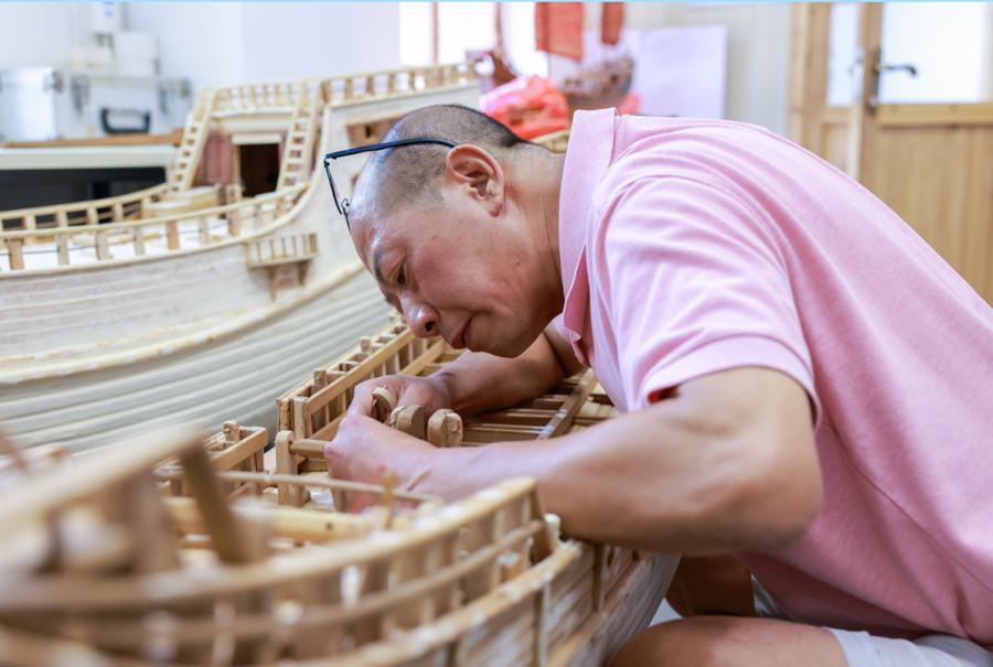 为了最大限度还原古船状态,从工艺到顺序都尽量照搬真船流程。船模不仅是舟船文化重要载体,对船舶建造改进和先进合理性研究能起巨大作用。“夜深人静,心最静,装零件时心无旁骛,做出来的船也精致。”黄东伟说。