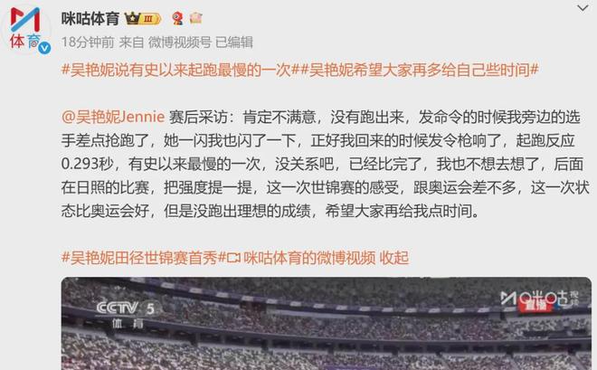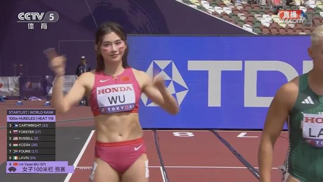 吴艳妮世锦赛首秀13秒12,遗憾止步预赛,吴艳妮起跑并不理想,反应时间0.293秒,对此吴艳妮也表示:“起跑太慢了,出了点小状况,理想成绩是跑12秒8,说实话自己的大赛经验和起跑还是有待提升。”