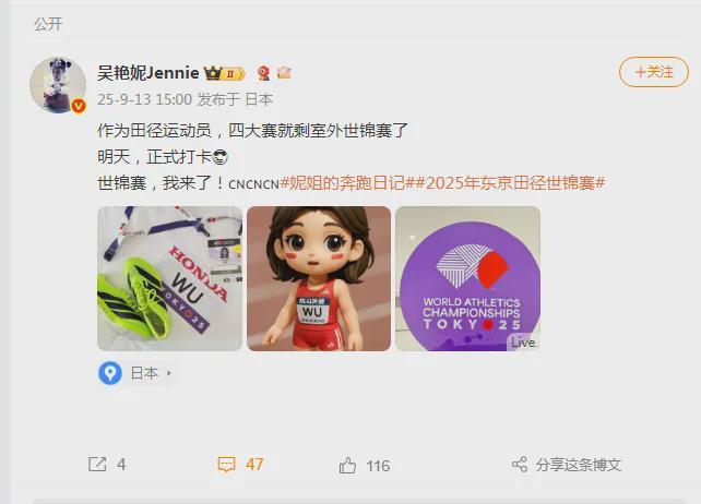 此前9月13日,吴艳妮发文透露,作为田径运动员,四大赛就剩室外世锦赛了。
