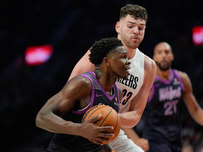 森林狼赢球后35胜23负,排名从西部第六升到第五,开拓者输球后28胜31负,排名西部第九。