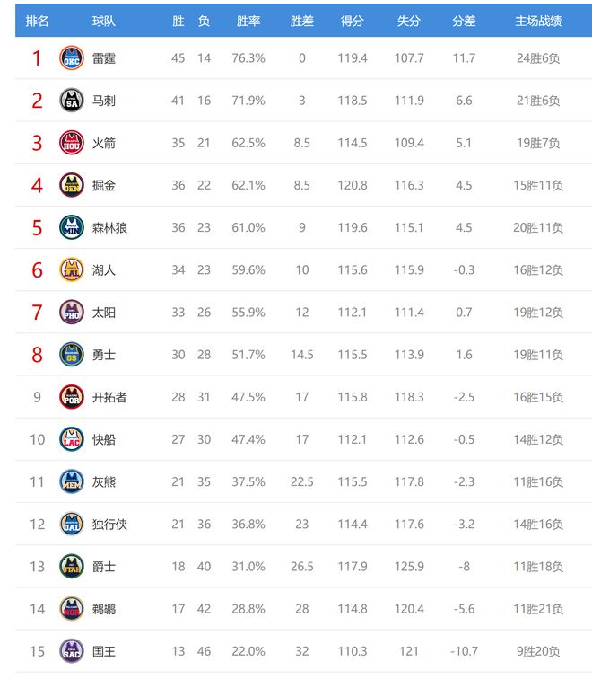 雷霆赢球后3连胜,战绩45胜14负,排名联盟第一。