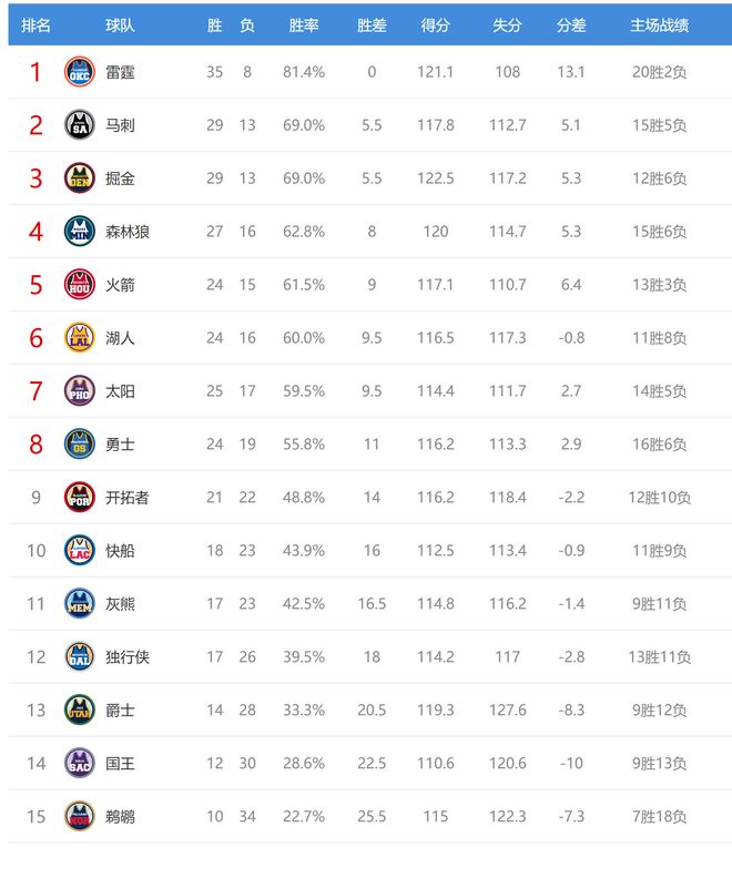 今日比赛后西部排名没有变化,但球队间的胜场差有所改变。