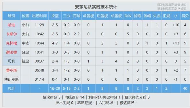 迪伦-哈珀迎着哥哥投进绝杀,安东尼队40-34淘汰小里弗斯队。杨瀚森替补出战8分钟,投篮5中4,三分2中1,罚球1中1,得到10分2篮板。得分全场第二高,仅次于尼德豪泽的11分。单场10分也超过了小杨常规赛最高分(9分)。