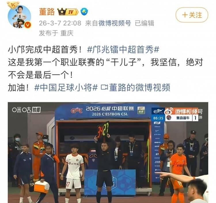 赛后,“足球小将”创始人董路在社媒晒出他登场的瞬间,一句“这是我第一个职业联赛的‘干儿子’,我坚信,绝对不会是最后一个”,满是期许与底气。16岁就站上中超赛场,被董路寄予厚望的邝兆镭,未来的职业规划该如何布局?